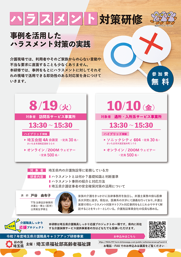 介護現場では、利用者やそのご家族からの心ない言動や不当な要求に直面することも少なくありません。本研修では、事例をもとにハラスメントに対してそれぞれの現場で活用できる即効性のある対応策を身につけていきます。